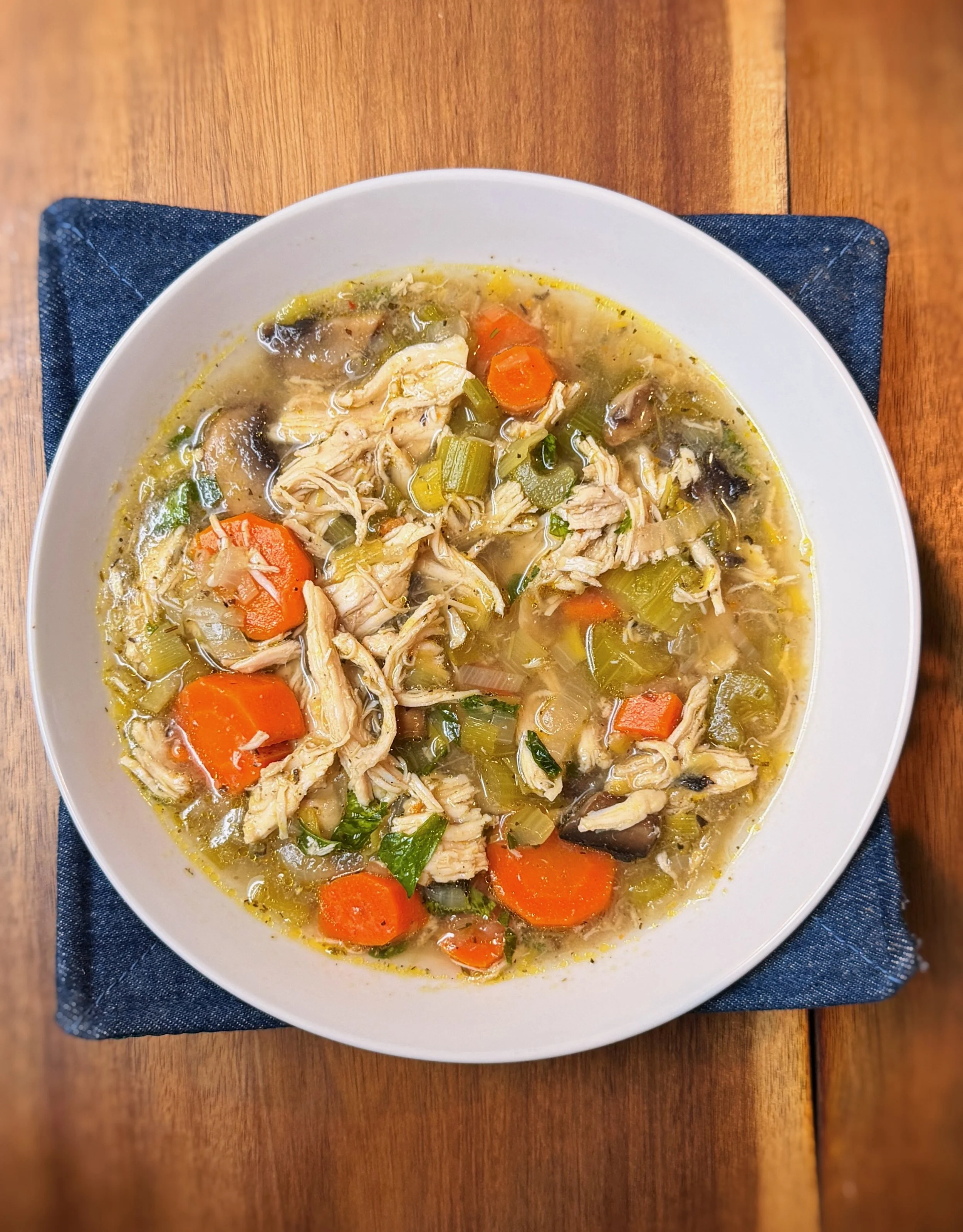 When the kitchen calls for something deeply flavorful, Root & Flame Chicken Soup answers back with a simmer that feeds the soul. Slow-cooked chicken breast, sweet carrots, tender leeks, earthy mushrooms all come together in a savory, herb-forward broth balanced with rice vinegar, fish sauce, and a spark of red pepper heat. This isn’t just comfort food, it rewrites what cozy tastes like.
